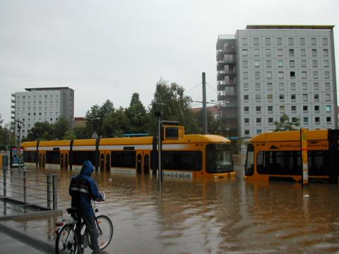 Man mag sich fragen, warum die Straßenbahnen nur hier geparkt wurden. Ursache war nach Aussagen der DVB der Ausfall des Fahrstromes - und damit die Bewegungsunfähigkeit der Bahnen als dort noch kein Wasser stand.