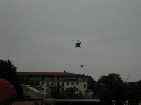 Seit nunmehr über 30 Jahren im Einsatz und auch in Dresden nicht müde, seinen Dienst zu tun - "Teppichklopfer" Bell UH 1-D bei Evakierungsarbeiten im Stadtteil Friedrichstadt.